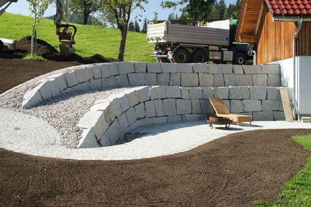 Unsere Baggerfahrer modellieren Ihr Gelände präzise und schaffen die perfekte Basis für stilvolle Wege, Steinmauern und Höhenniveaus in Ihrem Garten.