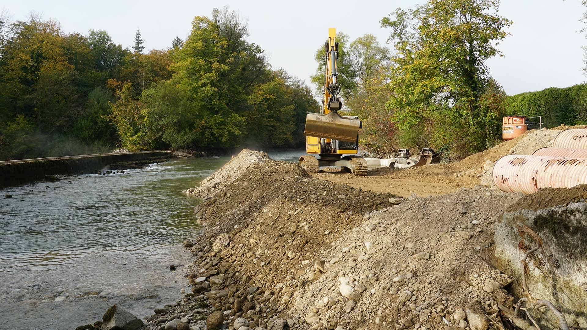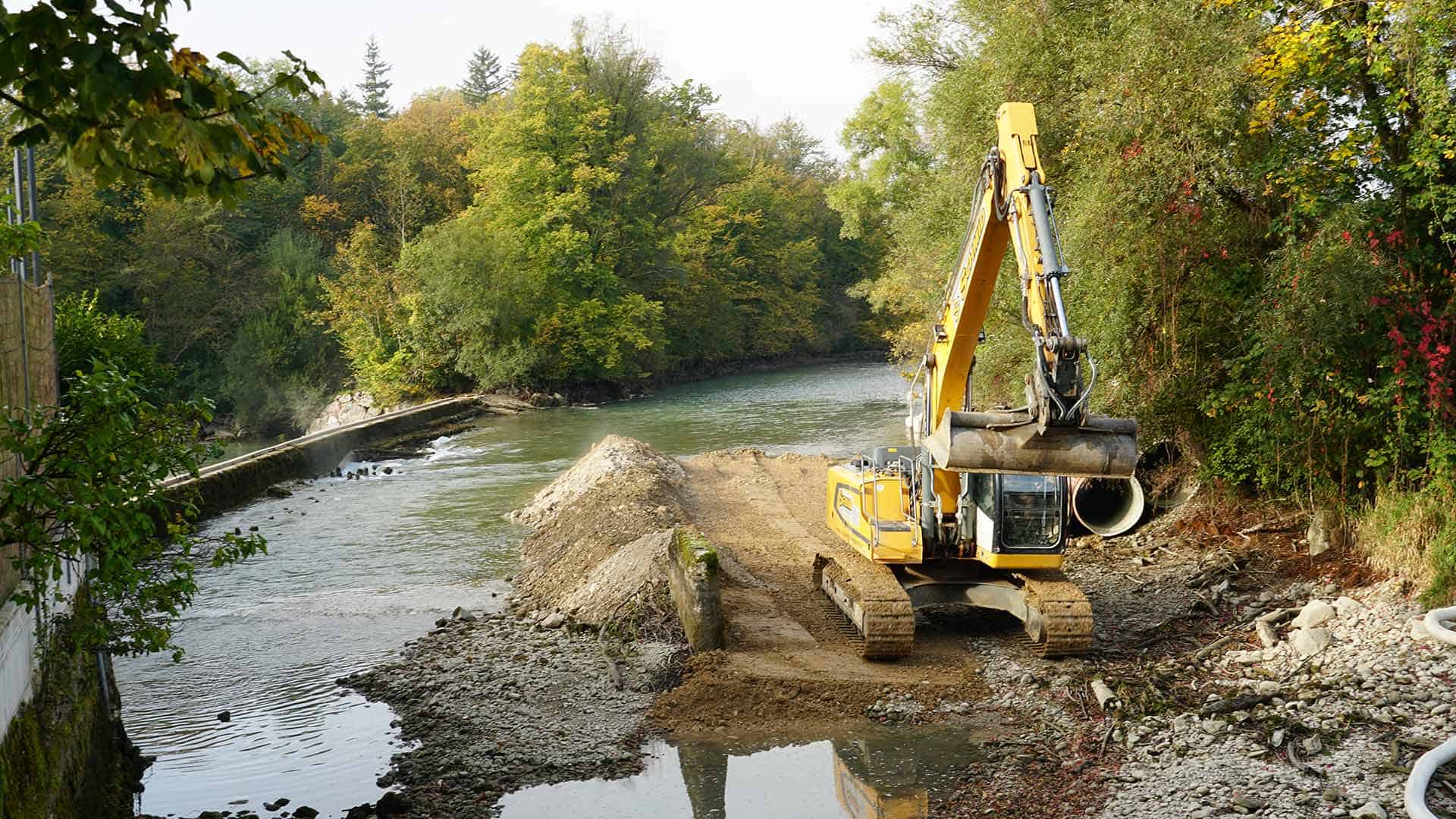 Schutzmaßnahmen für das Arbeiten am offenen Flussbett unter schwierigen Bedingungen.