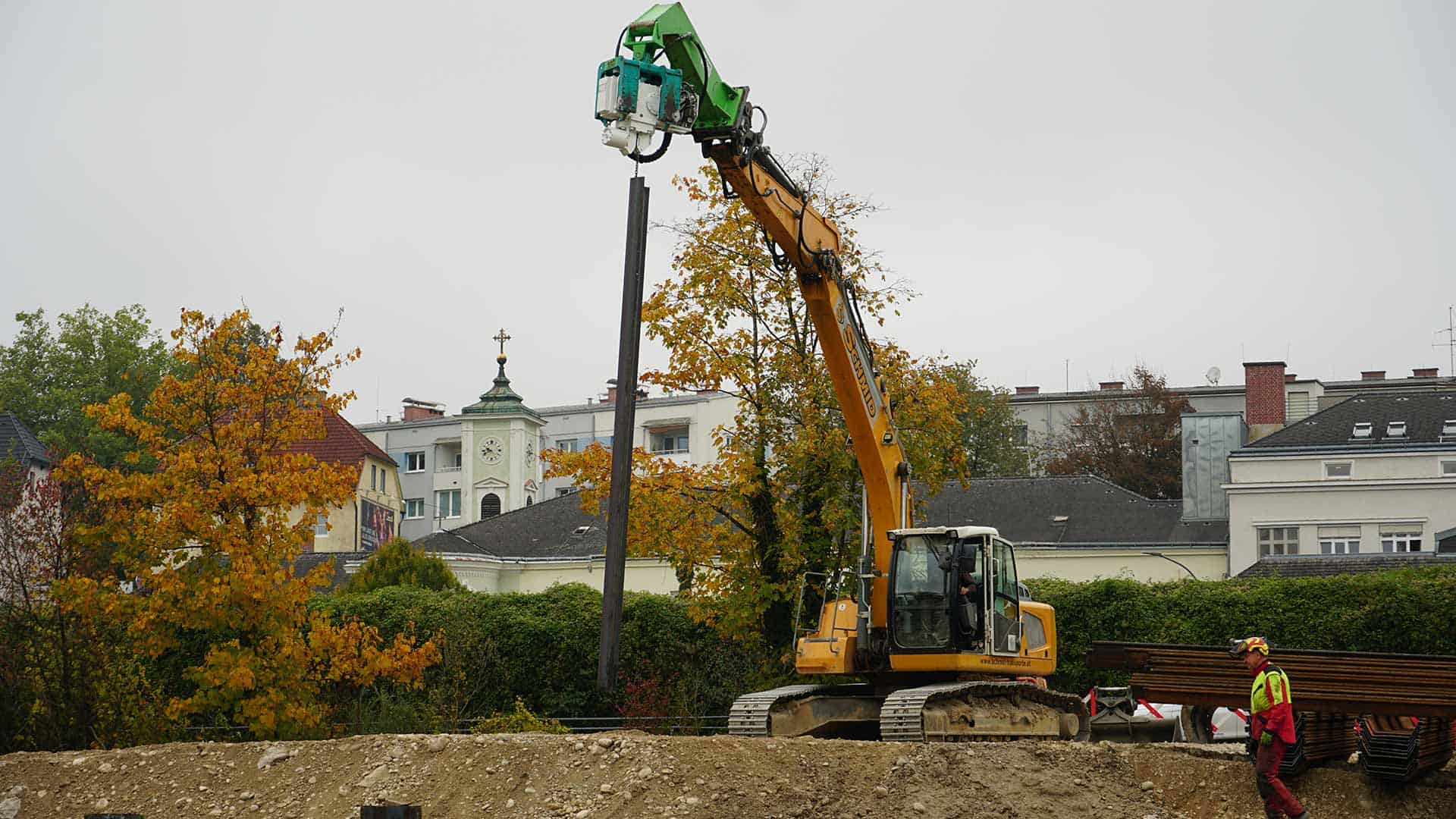Einbringen robuster Spundwände zur Absicherung der Flussböschung und Stabilisierung der Strömung.