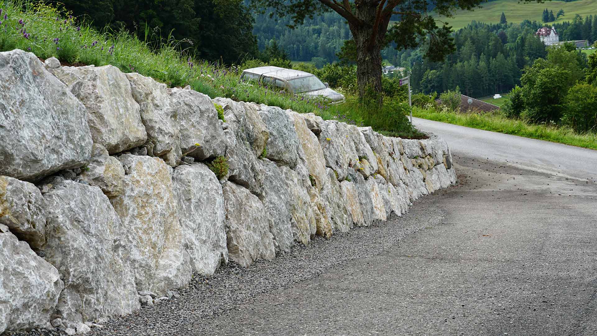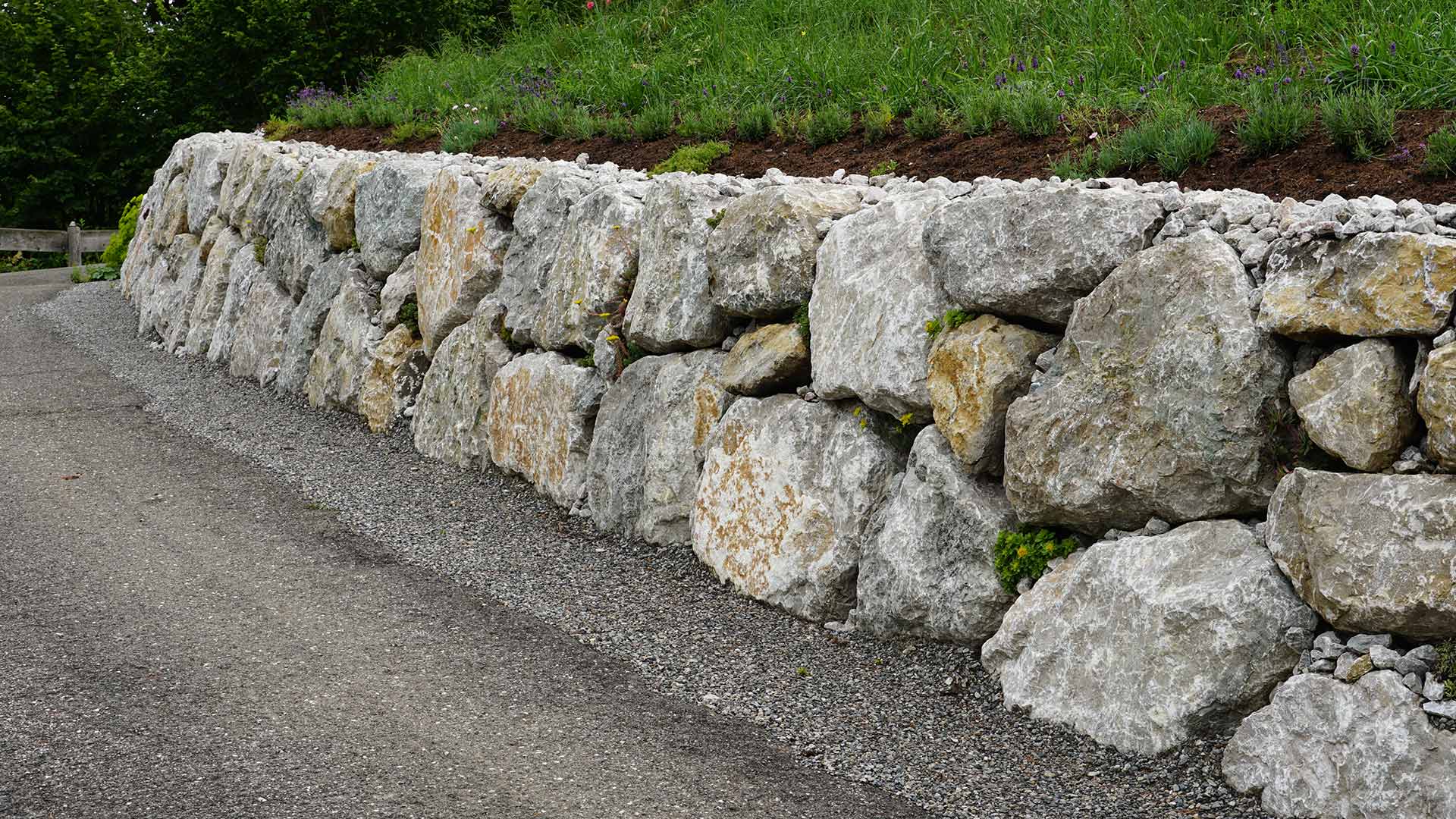 Die Steinschlichtung wurde harmonisch in das bestehende Gelände integriert. Durch die Auswahl regionaler Kalksteine entstand ein natürliches, ansprechendes Gesamtbild.