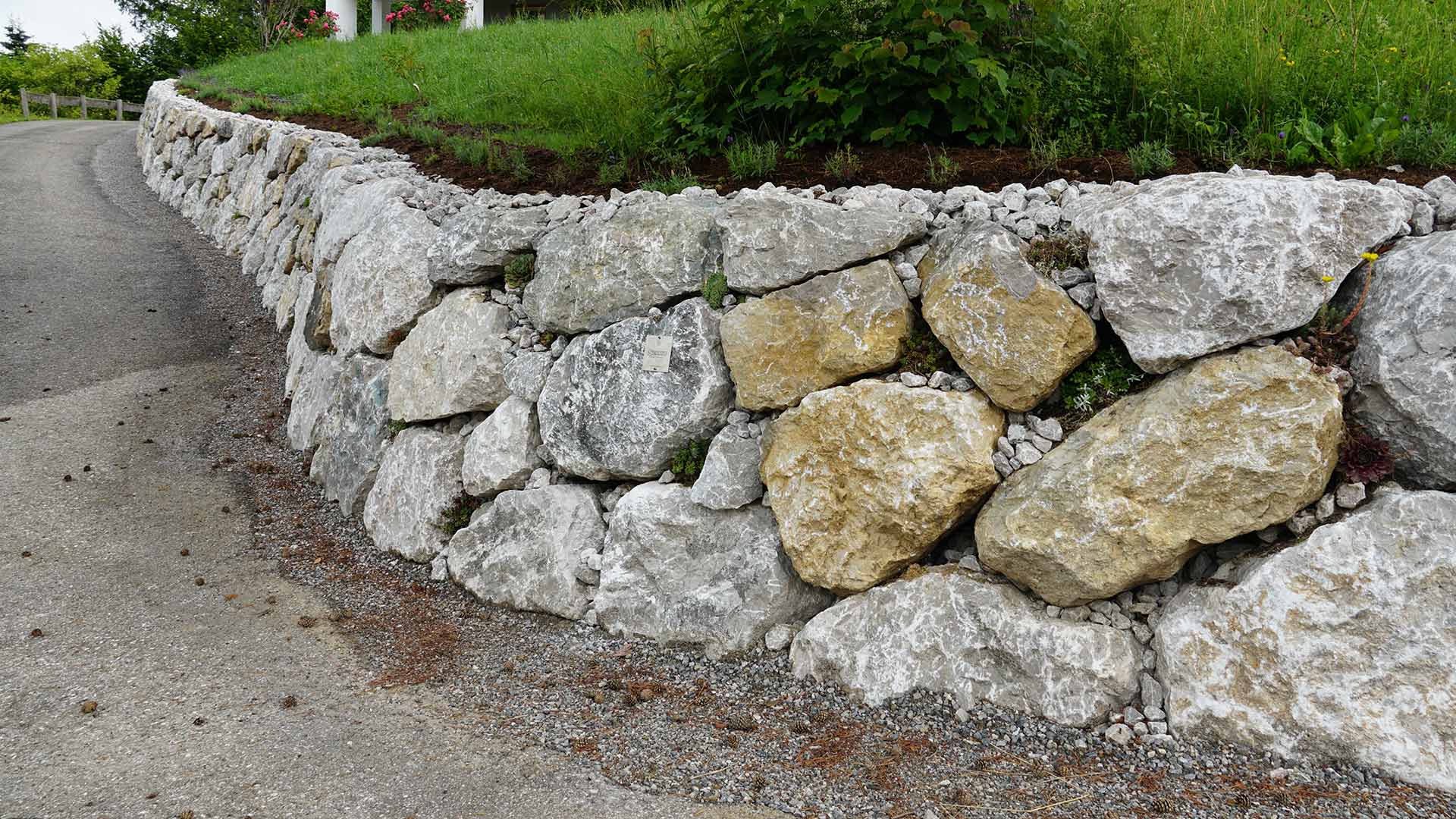 Die natürliche Hanglage direkt neben einer privaten Zufahrt machte eine zuverlässige Sicherung notwendig. Mit einer standfesten Steinschlichtung aus Kalkstein wurde der Hang gesichert und gleichzeitig optisch aufgewertet. Ziel war eine dauerhafte Lösung, die sowohl funktional überzeugt als auch zum bestehenden Gelände passt.